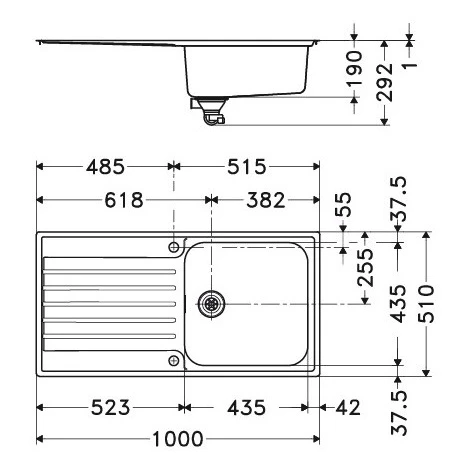 Dimensions : 1000 x 510 mm Découpe : 987 x 497 mm Bassin : 435 x 435 x 195 mm Grande cuve Caisson : 600 mm Gabarit de découpe : non A encastrer ou affleurer
