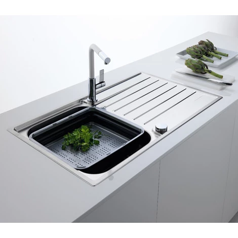 Montage broyeur impossible pour les modèles AGX uniquement Bonde automatique dans la grande cuve Bouton rotatif inox Trop plein exclusif, discret, esthétique et facile à nettoyer