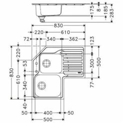 – Evier percé ø 35 pour robinetterie et commande rotative