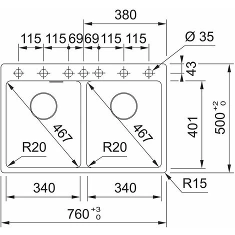 Evier pré-percé ø 35mm pour robinetterie et commande de vidage