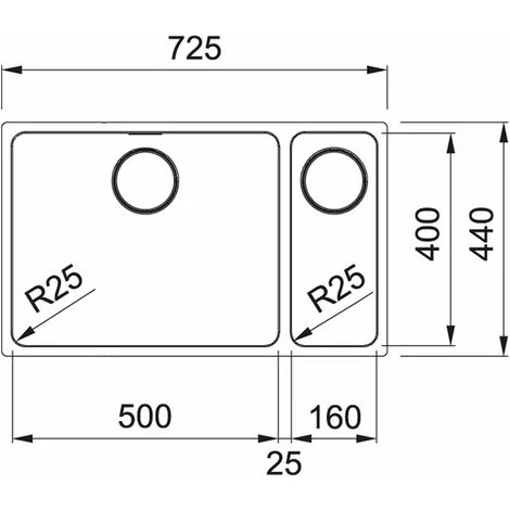 Rayons 25mm en haut et 10mm en bas dans les angles de la cuve