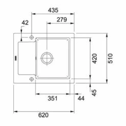 Dimensions : 620 x 510 mm. Découpe : 600 x 490 mm. Bassin : 350 x 420 x 200 mm.