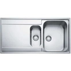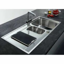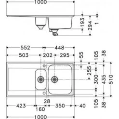 Dimensions : 1000 x 510 mm Découpe : 987 x 497 mm Bassins : 350 x 435 x 175 / 160 x 300 x 120 mm Caisson : 600 mm Gabarit de découpe : non A encastrer ou affleurer