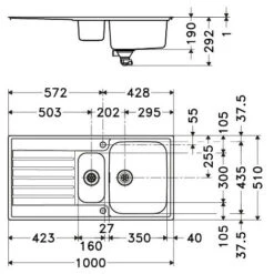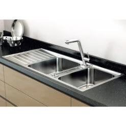 Dimensions : 1160 x 510 mm Découpe : 1147 x 497 mm Bassins : 350 x 435 x 190/320 x 430 x 190 mm Caisson : 800 mm Gabarit de découpe : non A encastrer ou affleurer